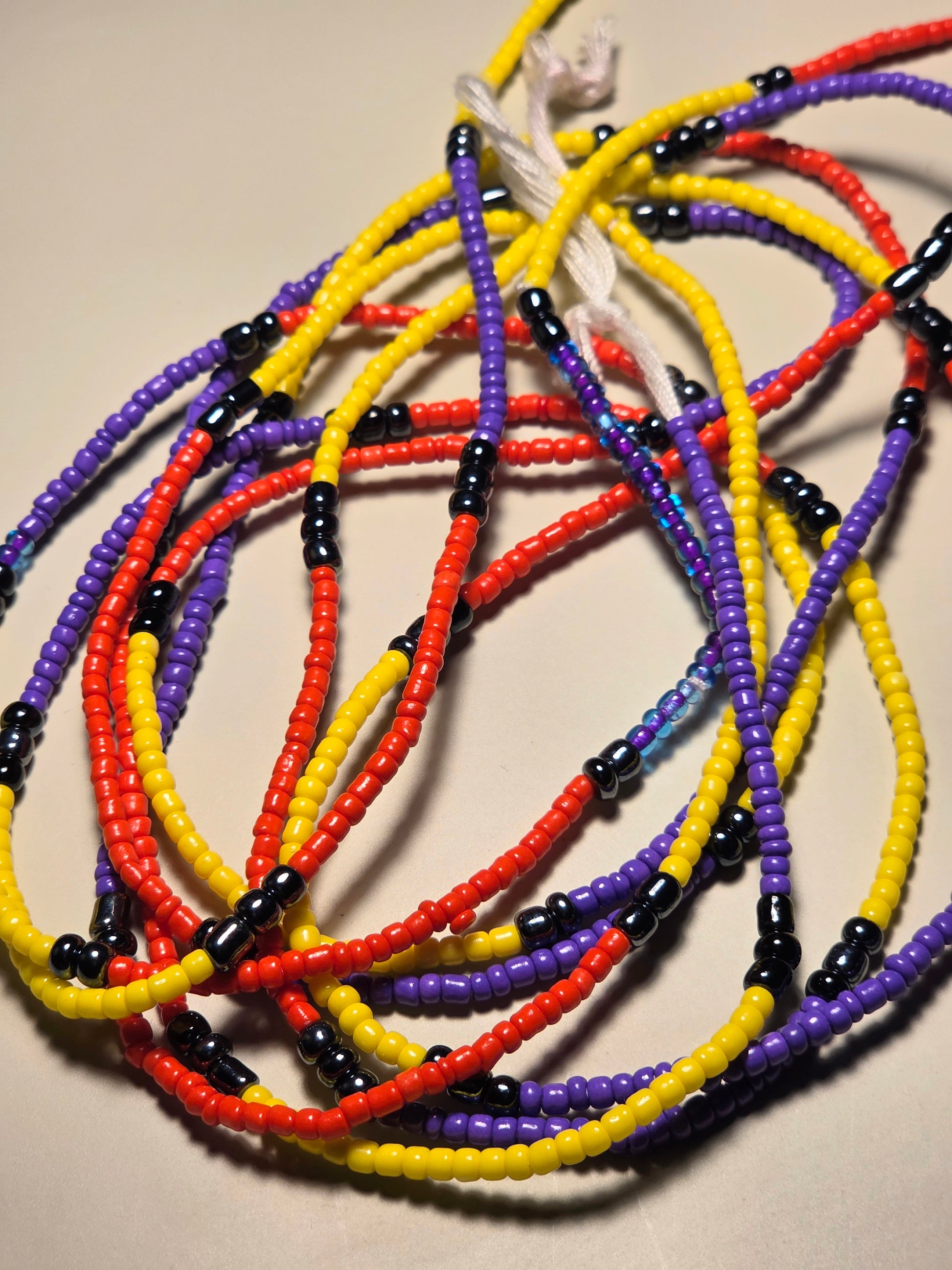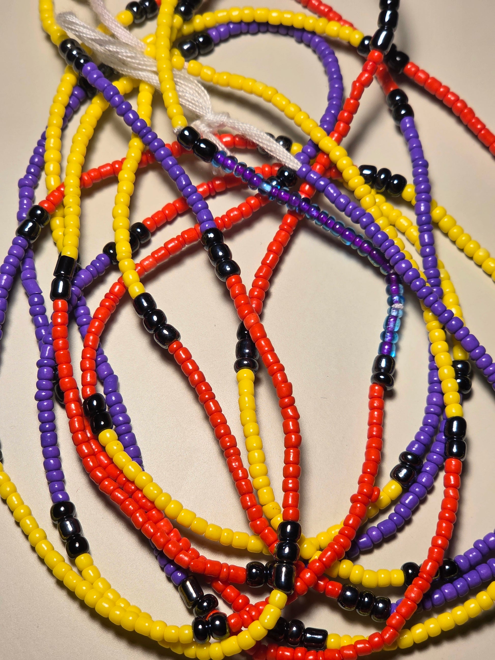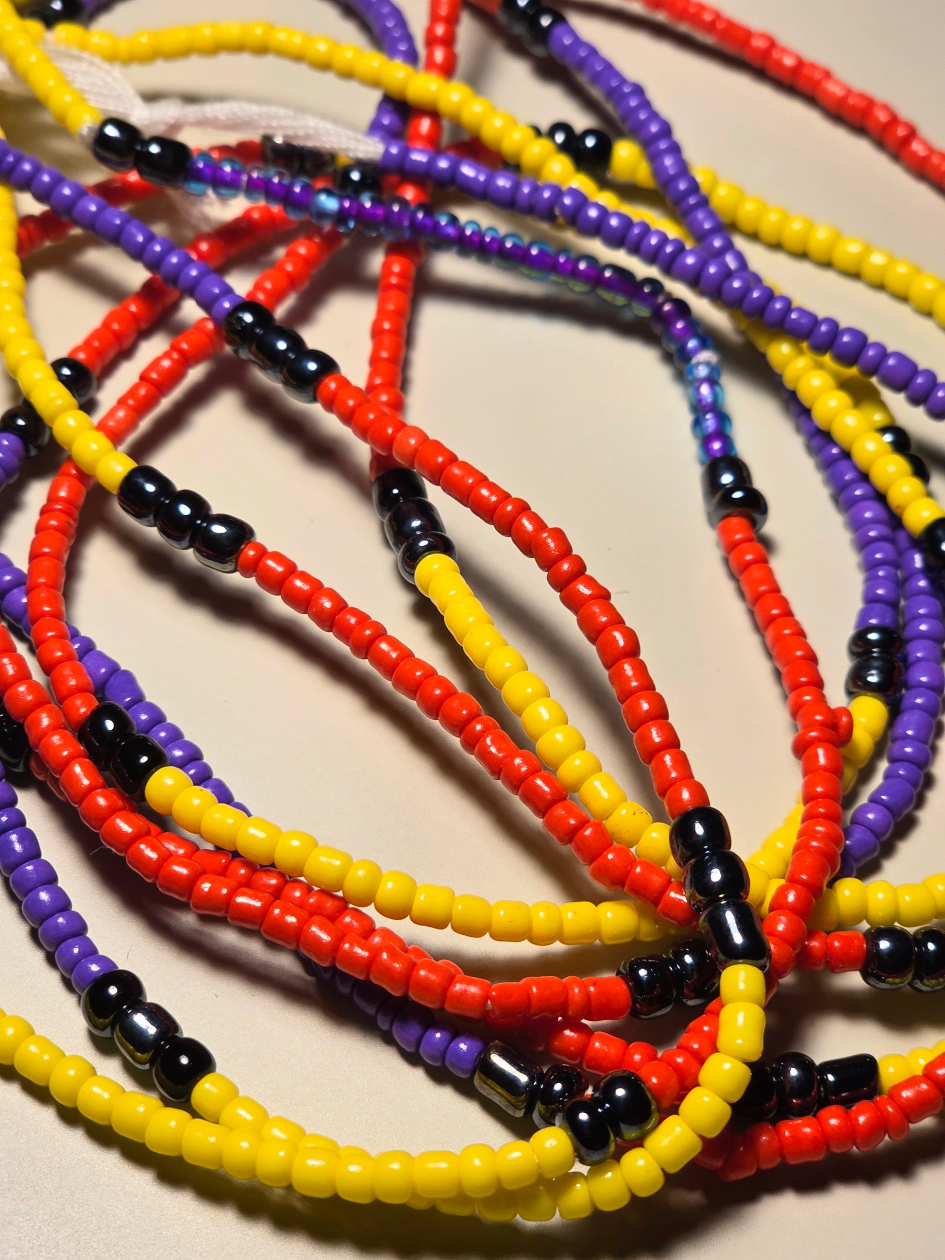 Blazing Phoenix is a waistbead crafted with yellow, purple, red, and metallic beads. The intention of this waistbead offers rebirth and fiery strength of a phoenix, combined with the regal essence of purple and the brilliance of metallic accents. This name radiates power, transformation, and luxury.