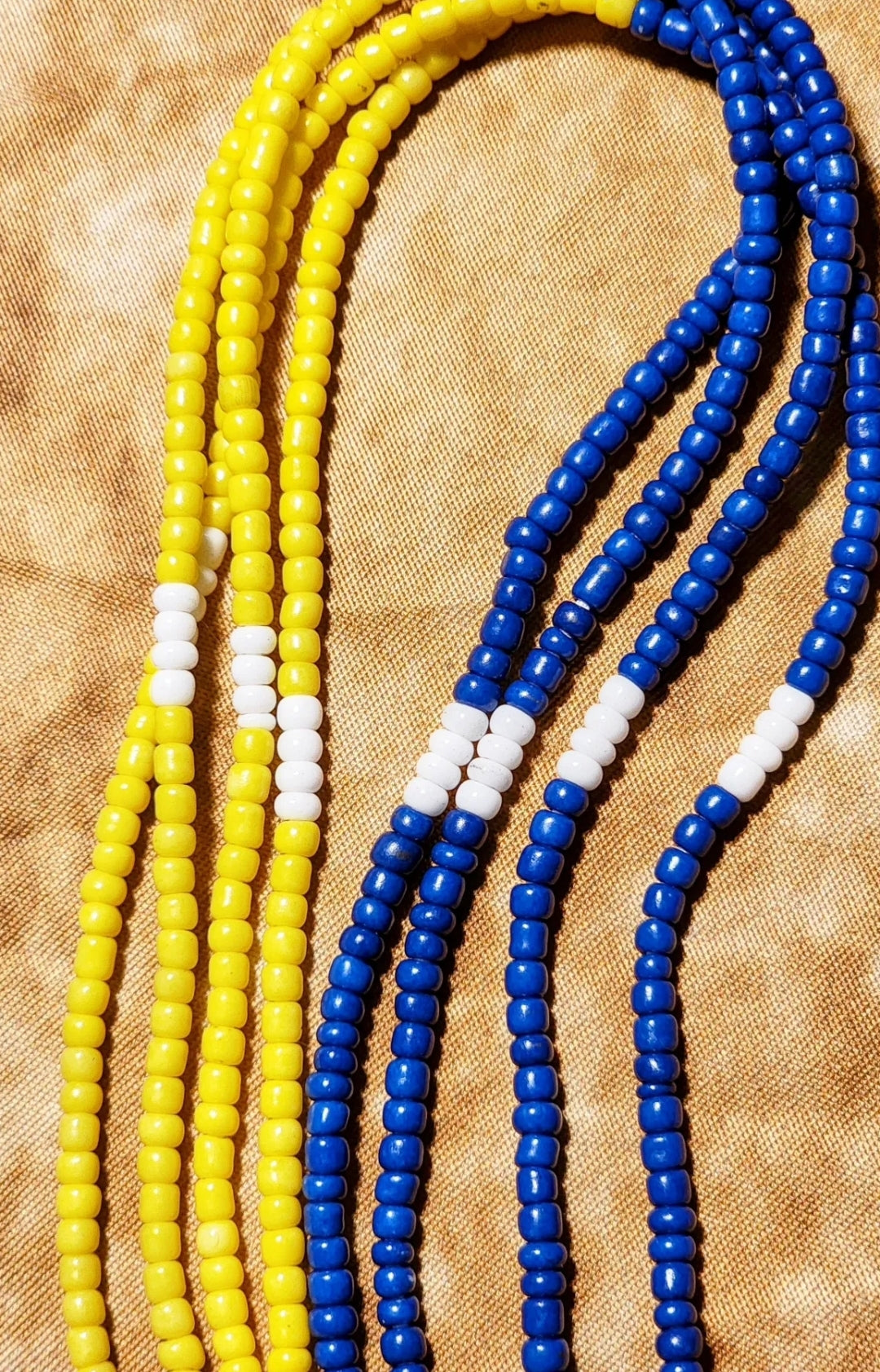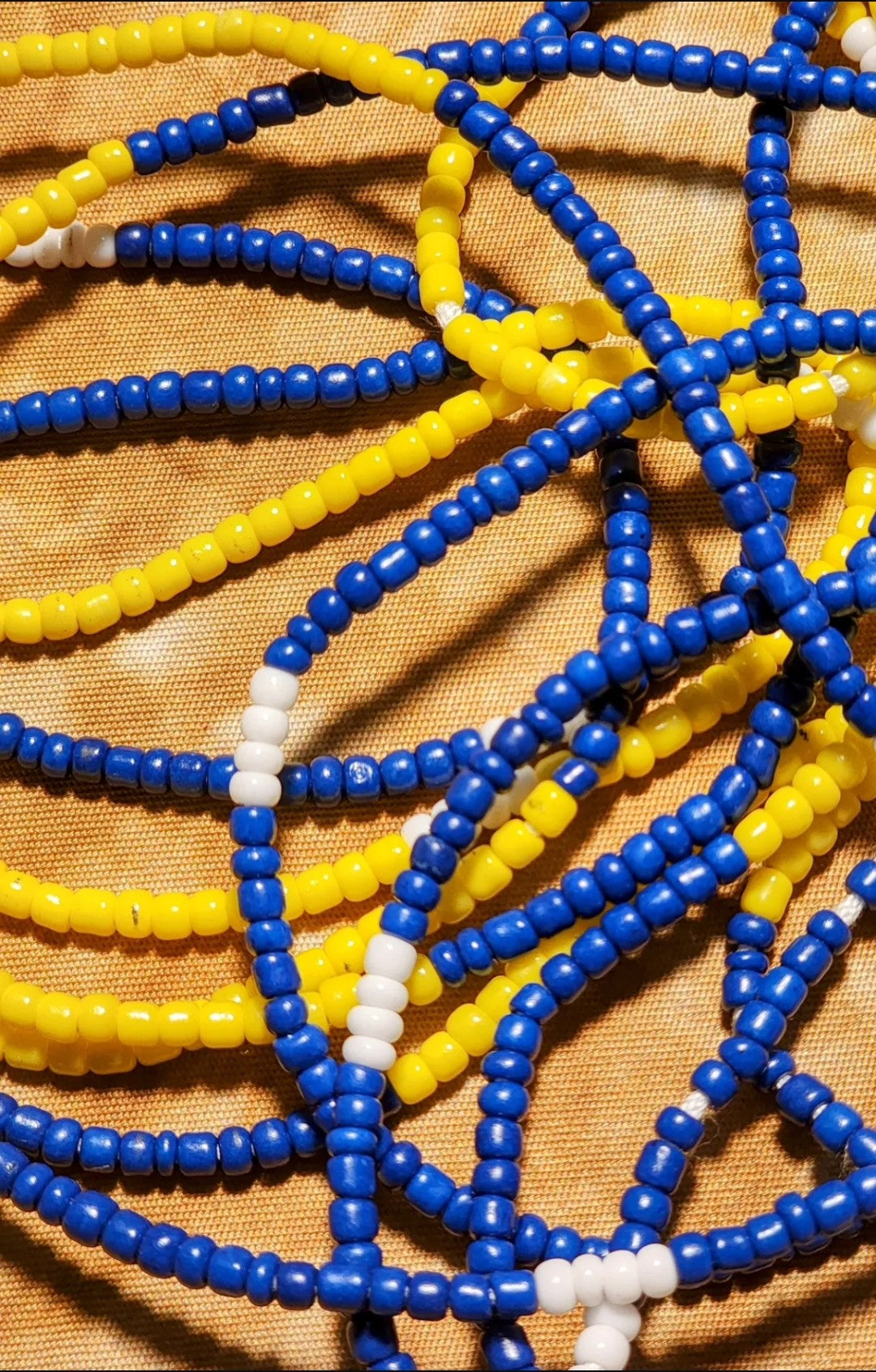 Blue for the sky, white for the rain, and yellow for the sunshine after the pain, this semi-permanent waistbead is charged with the grace of our earthly elements.