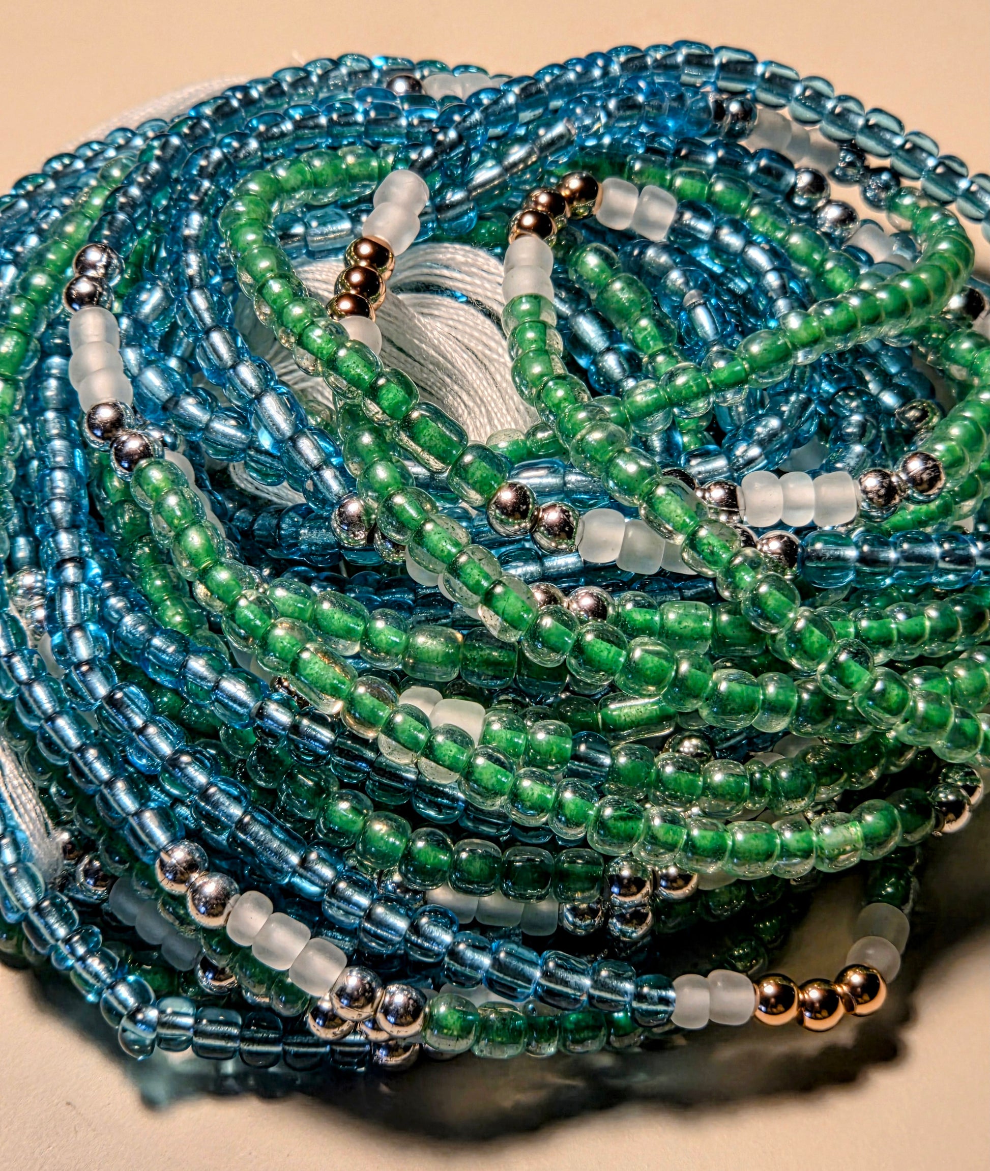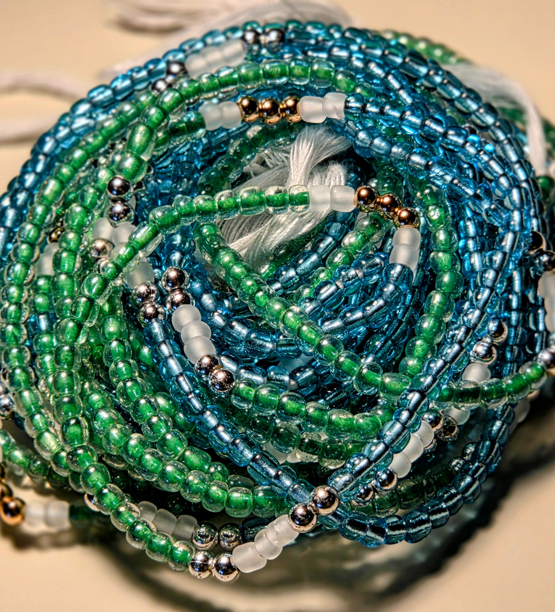 Crafted for the guardian of the zodiac, this waistbead is a gentle armor of love and intuition. Clear-frosted, seafoam blues, and silvery beads evoke moonlight on still water—serene yet endlessly deep. Like Cancer herself, it holds space: for healing, for feeling, for fierce protection cloaked in tenderness. For the woman who feels everything and hides nothing from herself. Let this Cancer waistbead remind you: your sensitivity is your strength, and your softness is your superpower.