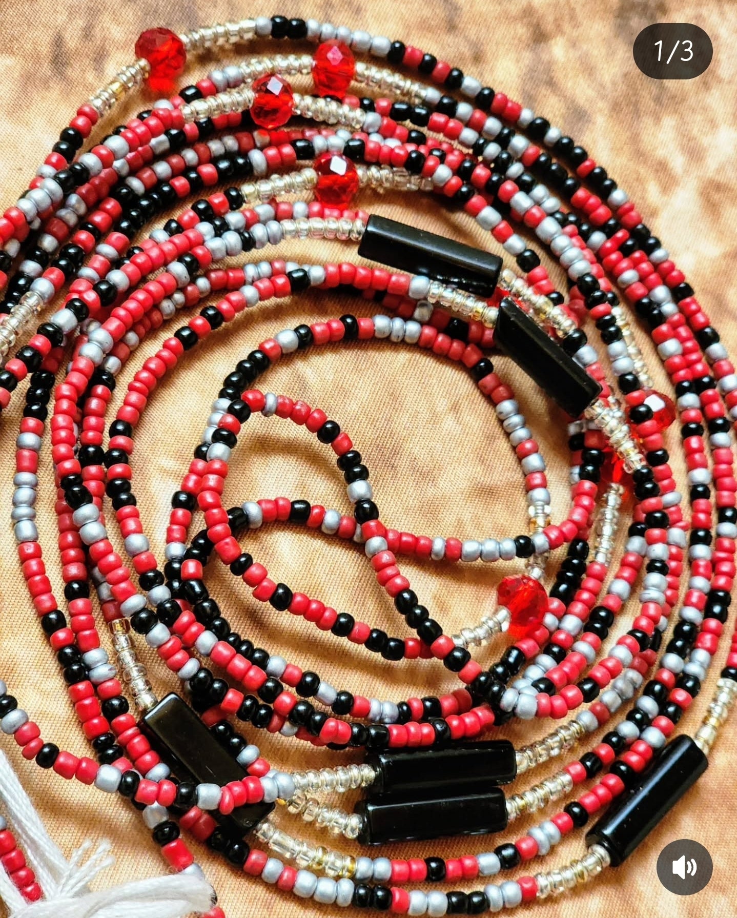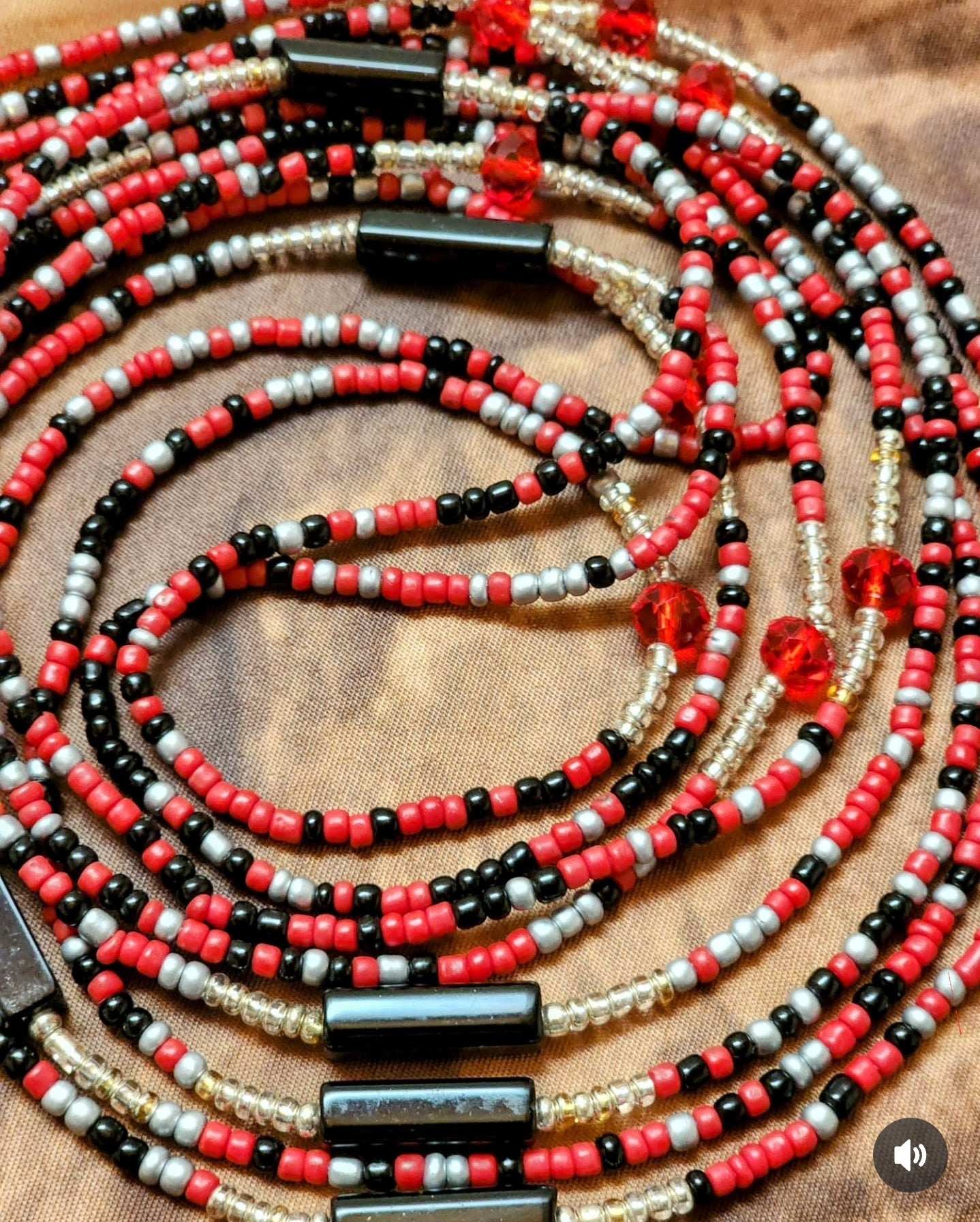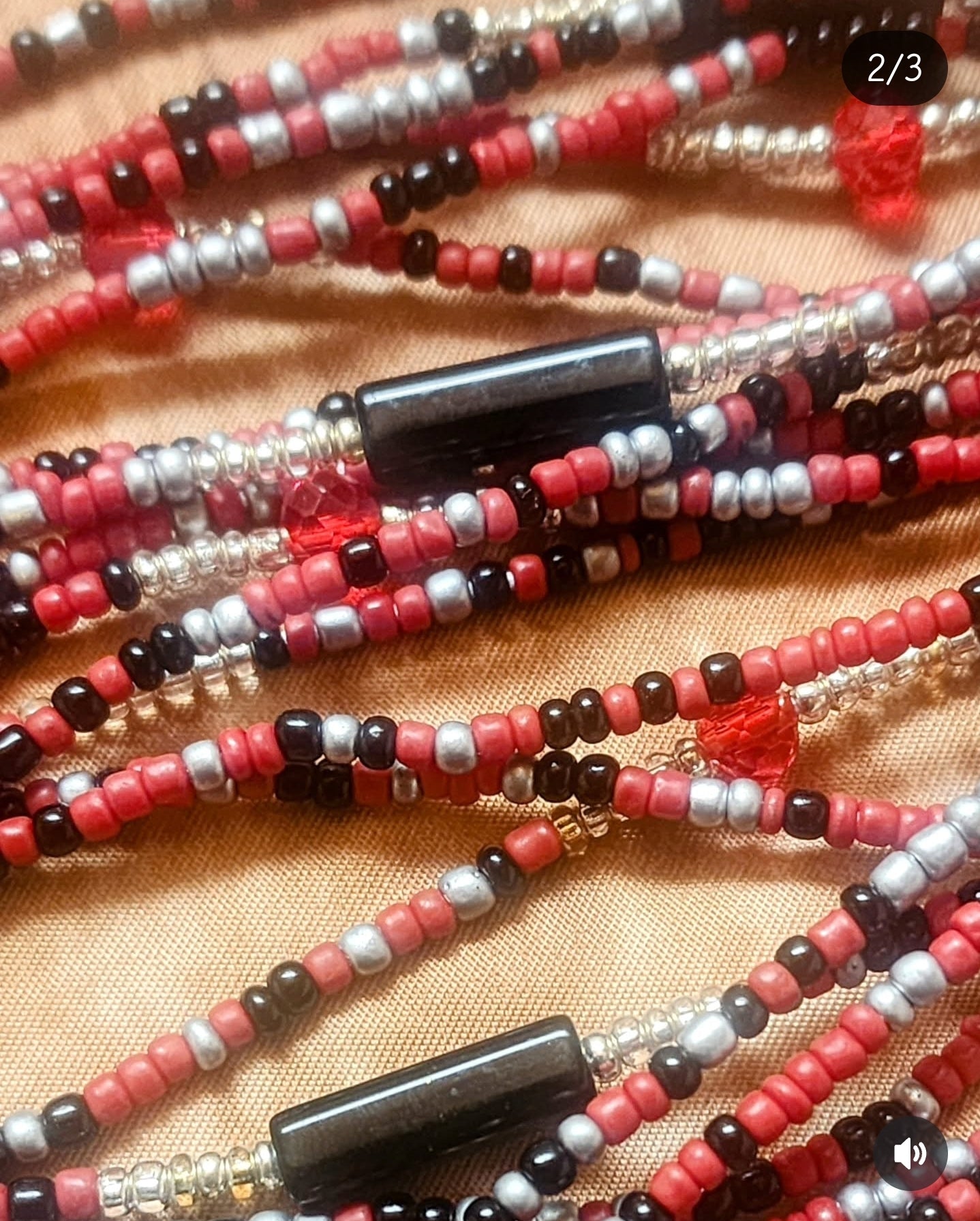 Created with hues of matte black, red, and silver beads with intentions to trust the intuition of your mind. Bet and believe in yourself. Do not doubt your thoughts, visions, or faith. Make a decision and become master of your fate with this particular waistbead.