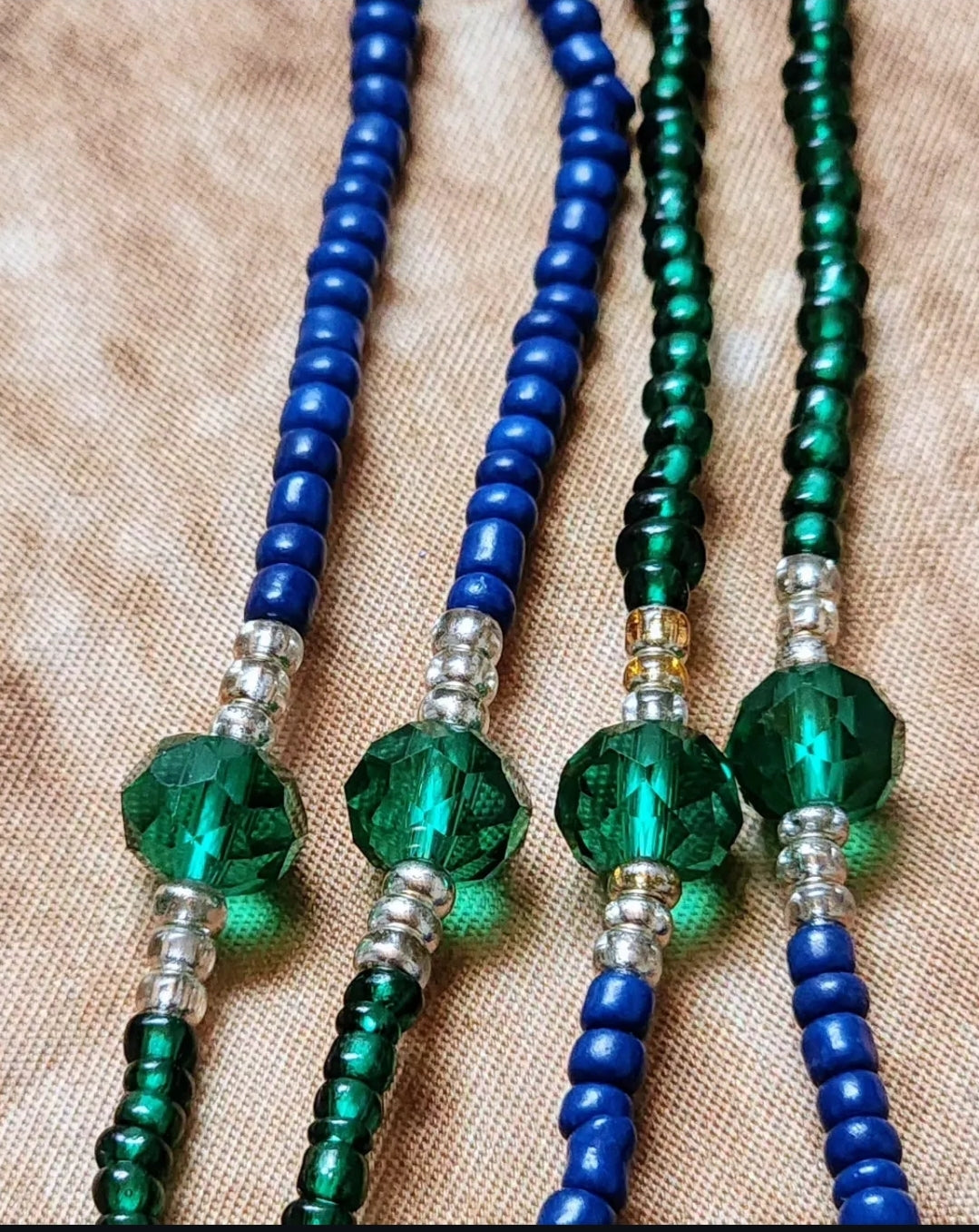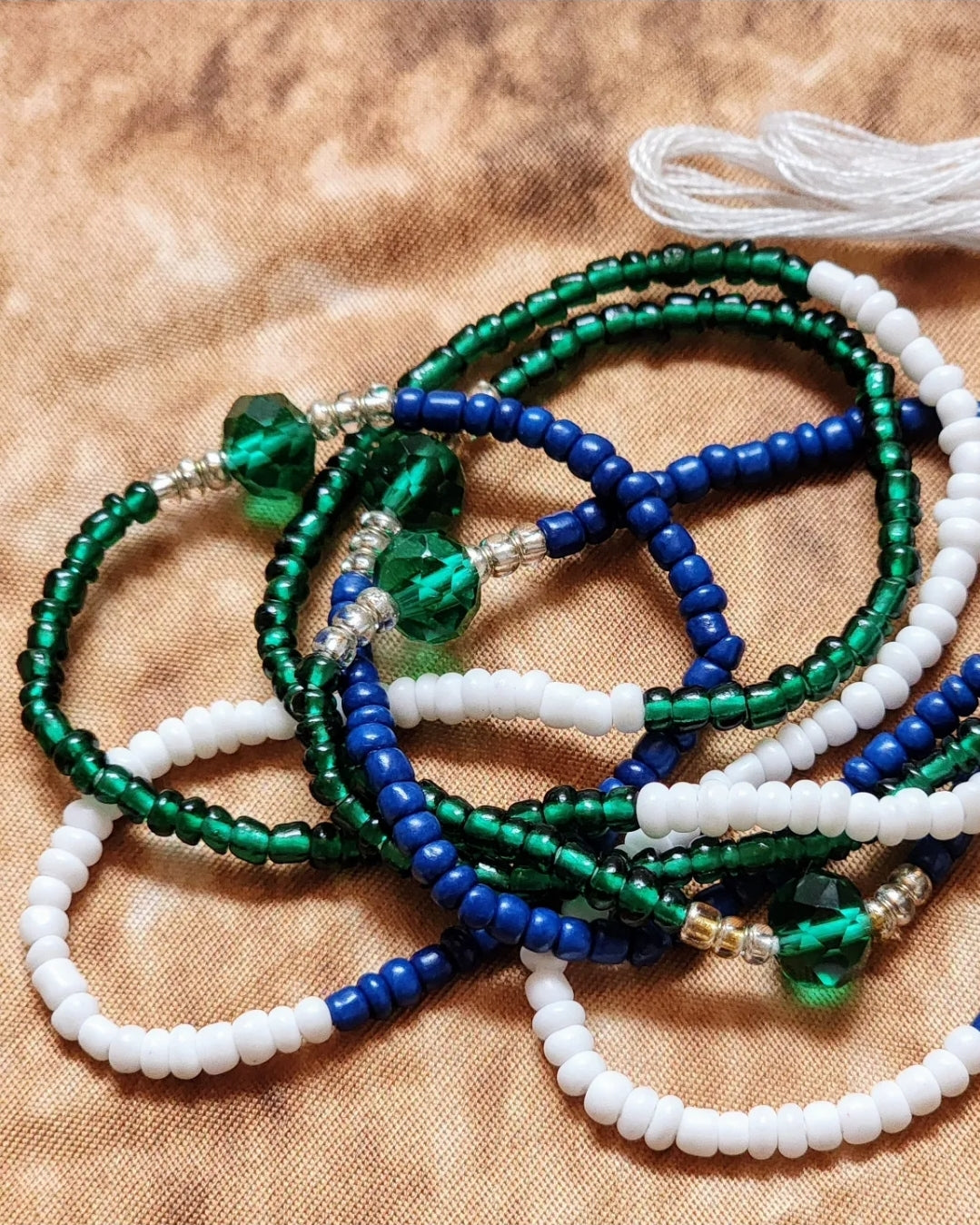 'Ms. Baddie' is a distinctively crafted semi-permanent waistbead with teal-blue, glossy green, and white with green rondelle beads.