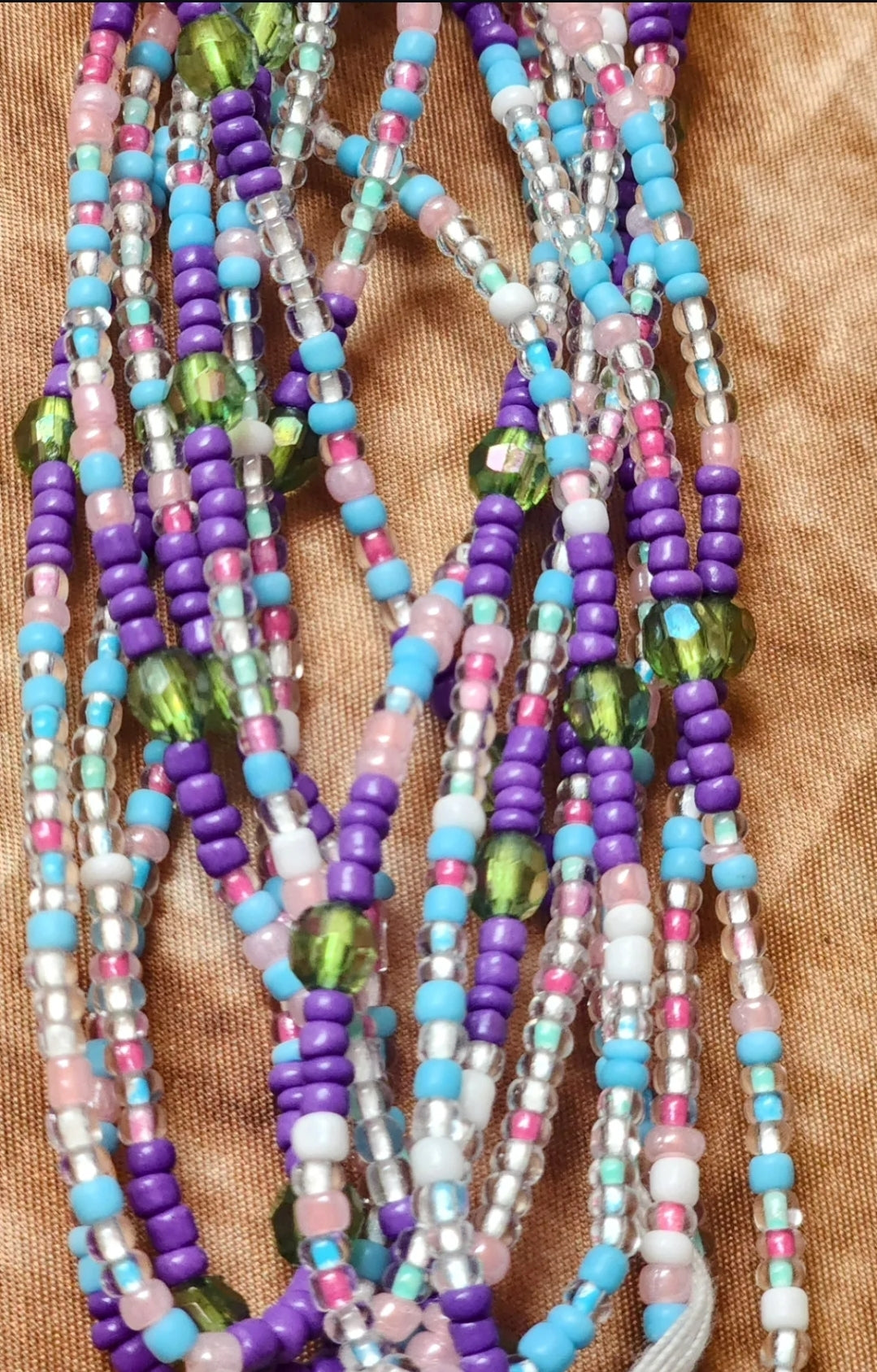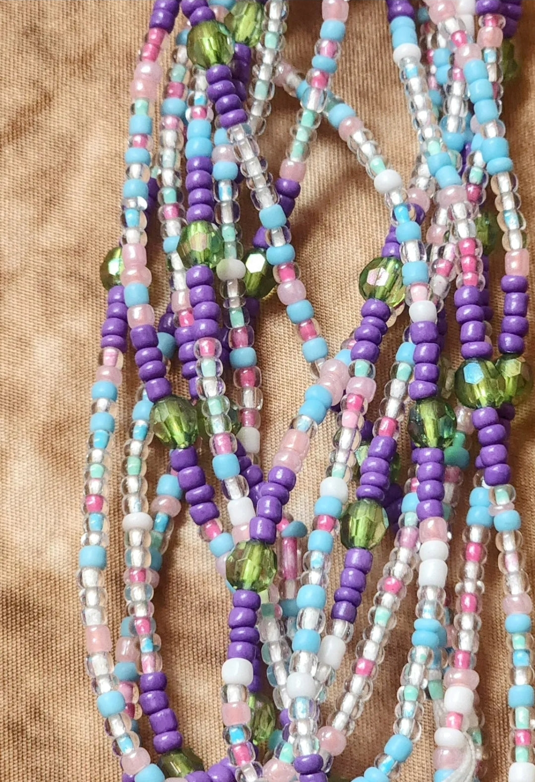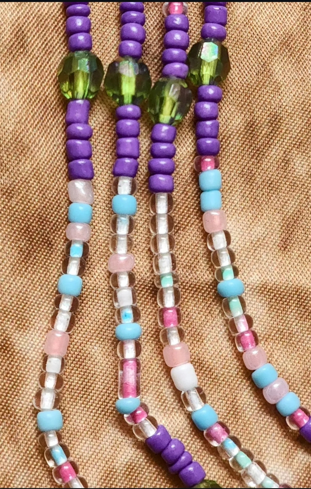 This 'Saturday Night Love' waistbead is a combonation of the colors purple, green, light pink, baby blue, with a hint of white beading, and green rondelle beading.