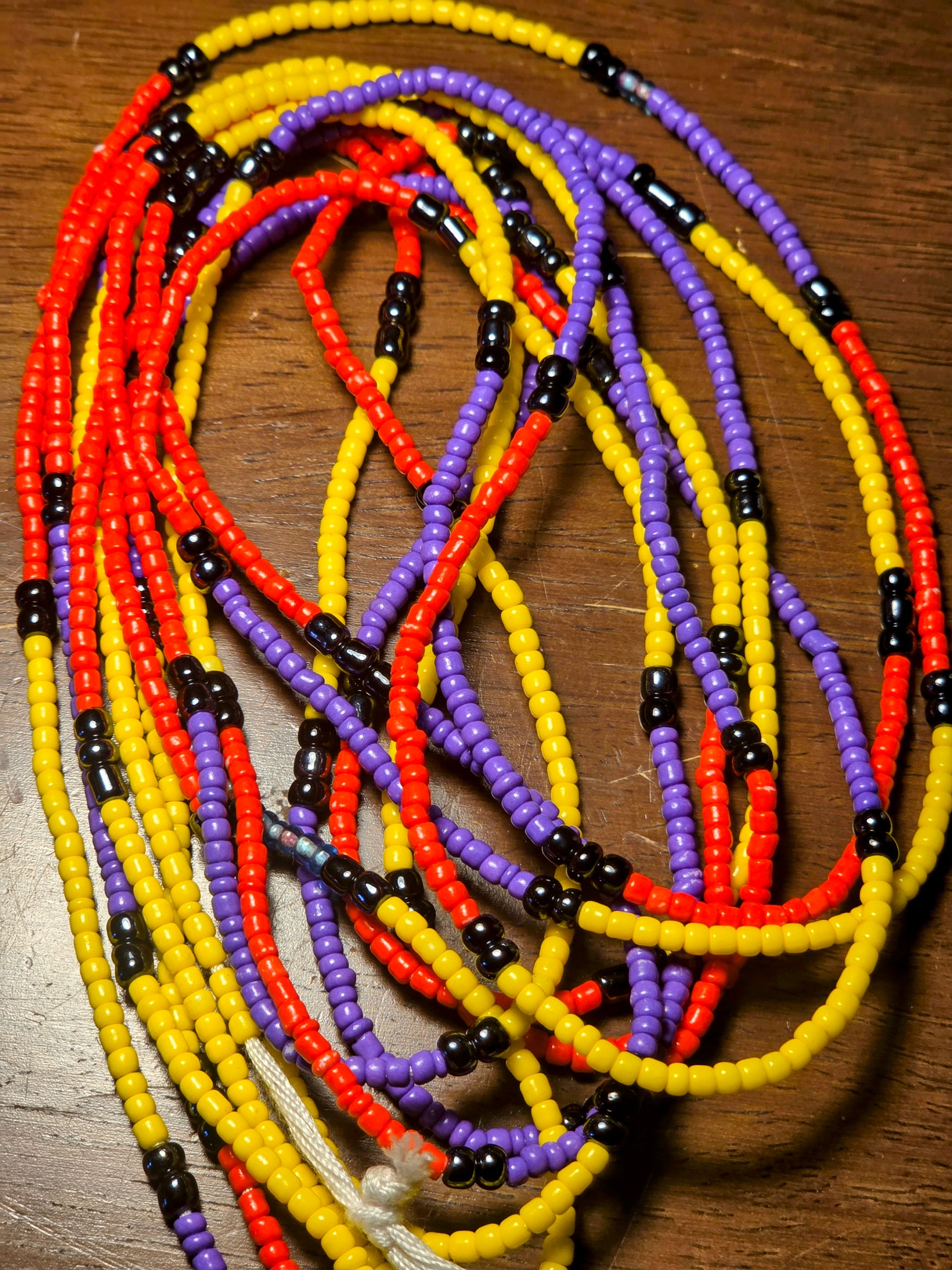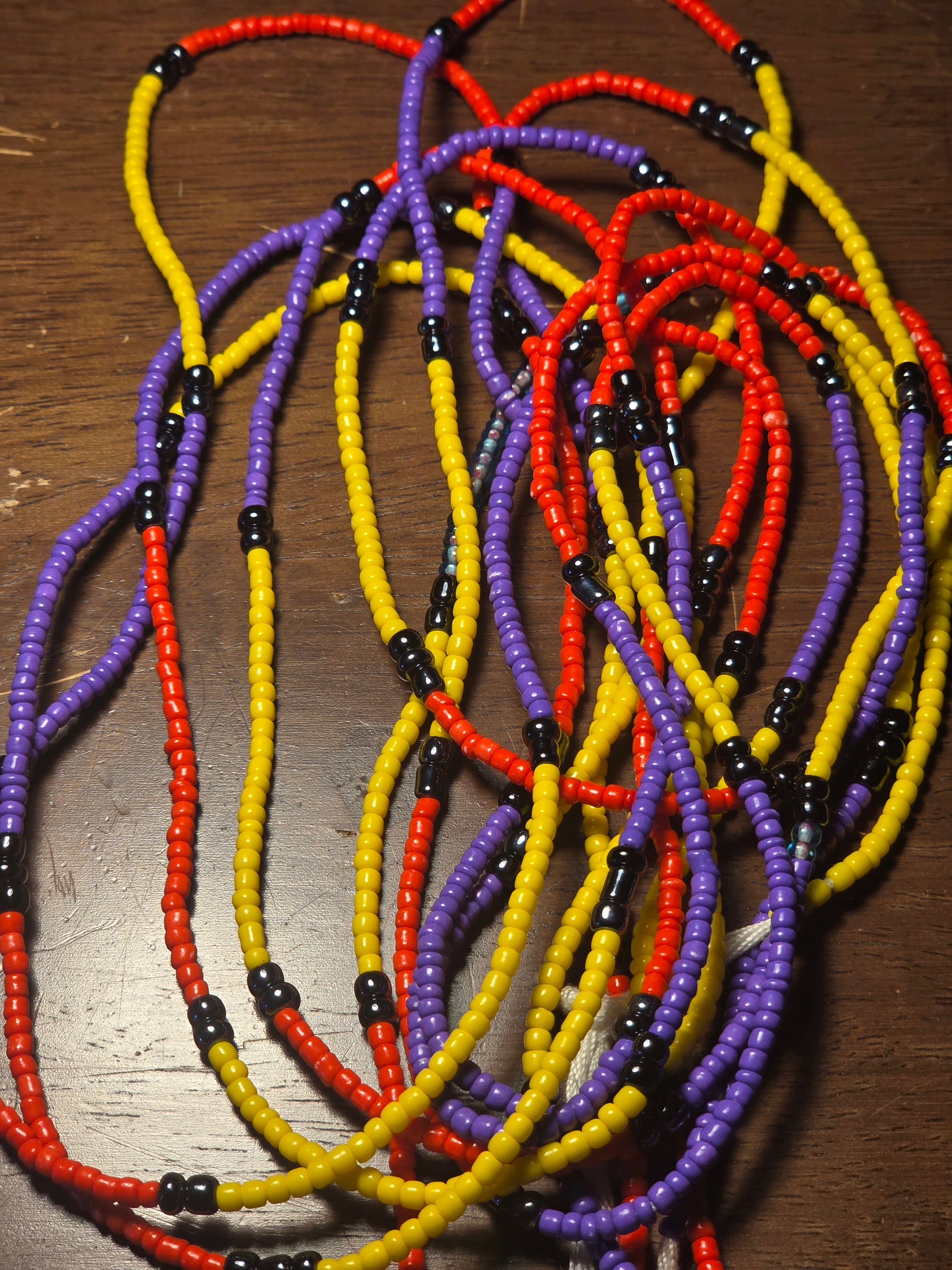 Solar Pulse radiates the rhythm of pure life force — where fire, spirit, and royalty intertwine. The bold red evokes passion and vitality, the golden yellow calls in joy and abundance, and the regal purple channels divine intuition. Accented with metallic gray beads that ground the energy, this strand celebrates balance between power and peace — a reminder that your light doesn’t just shine, it pulses with purpose.