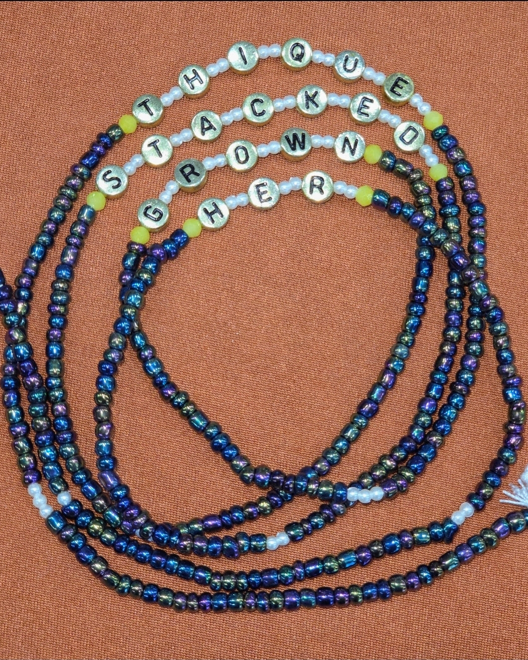 With bold words like THIQUE, STACKED, GROWN, and HER, this waistbead celebrates softness, shape, maturity, and the kind of confidence that can’t be taught.